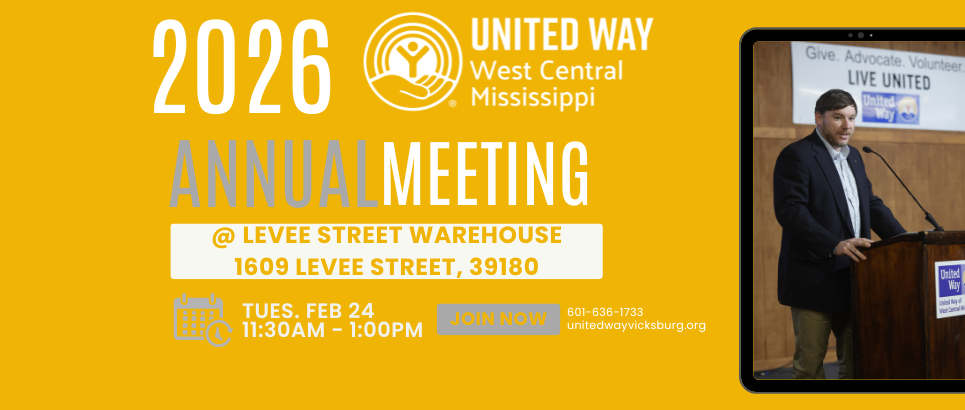 Join us for United Way of West Central Mississippi’s Annual Meeting as we come together to celebrate the wins of 2025 and the impact made across our community. This special gathering will include honoring our outgoing board chair, welcoming our new chair, and reflecting on the progress made through our work. Guests will enjoy a delicious lunch catered by Goldie’s Express while we look ahead to the future and share our newly launched Community Agenda—setting the course for continued collaboration, growth, and impact across West Central Mississippi.
